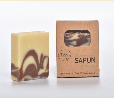 Sastav: Saponifikovano maslinovo, palmino i kokosovo ulje, kakao, destilovana voda, NaOH. Eterično ulje narandža i cimet